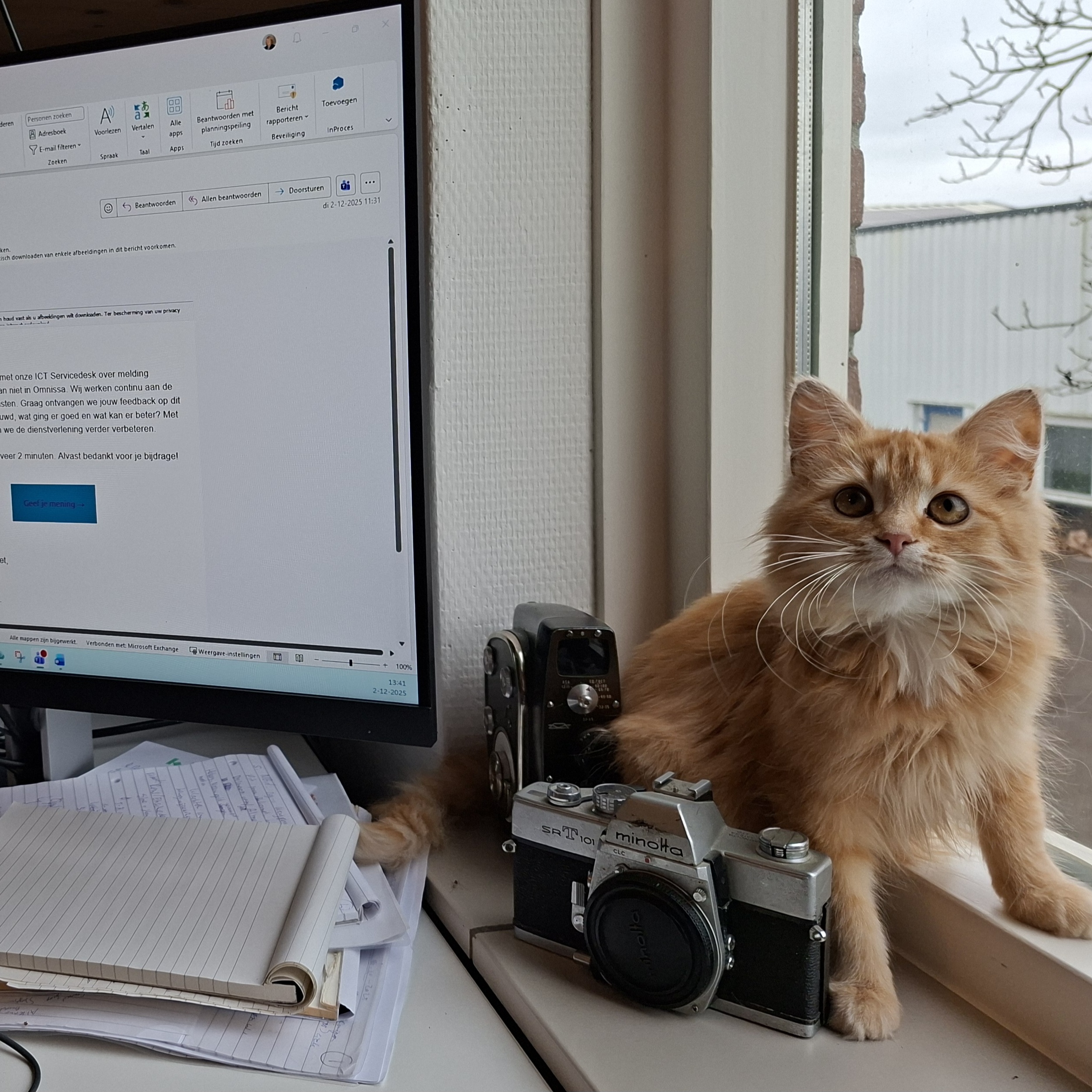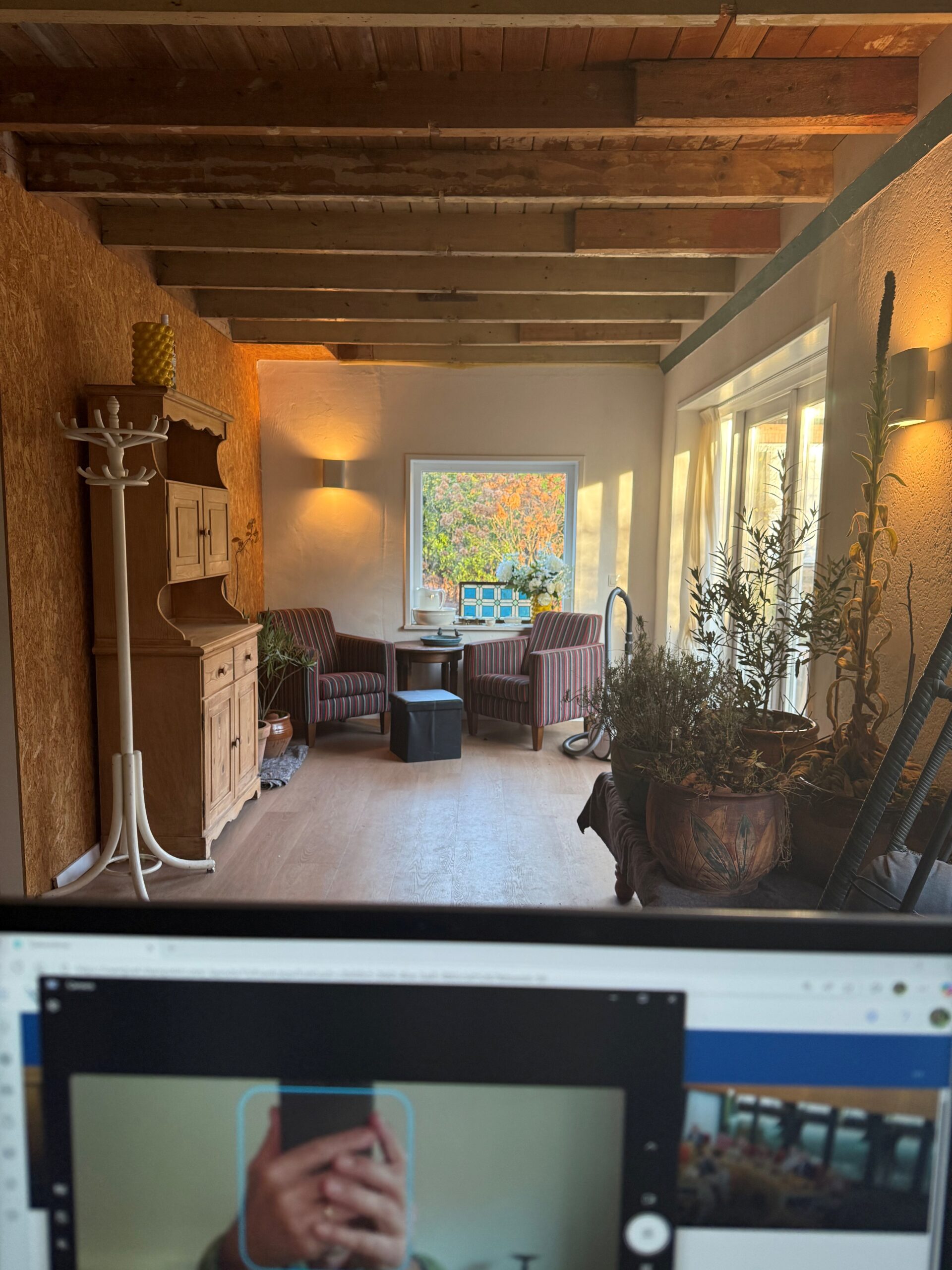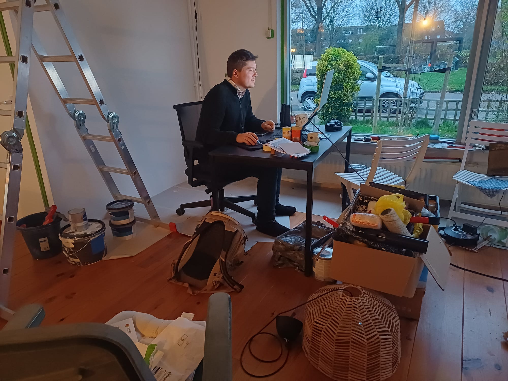 Dit is de thuiswerkplek van Ives van NM (In de winterstalling van onze olijfboom en oleander)