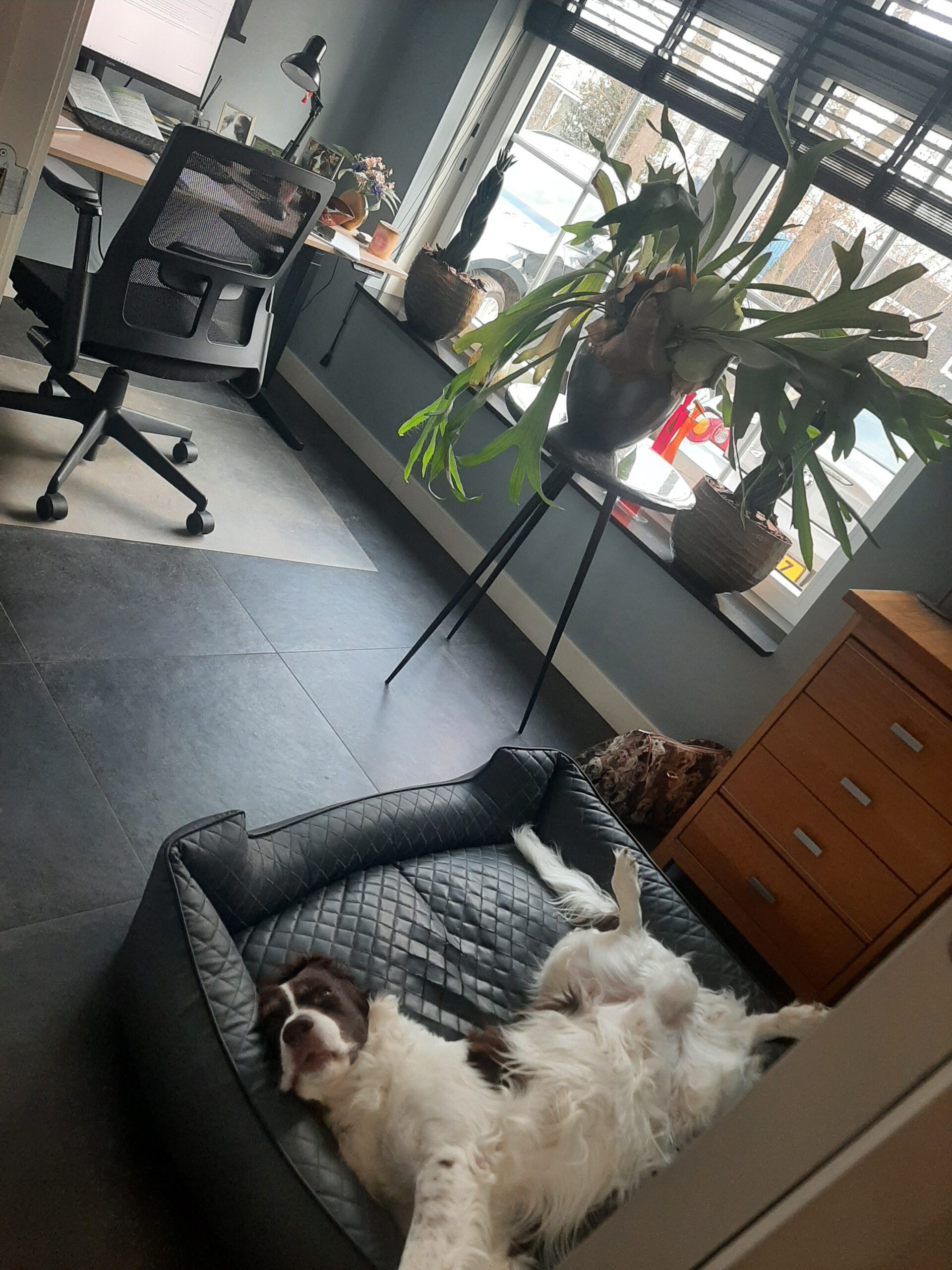 Dit is de thuiswerkplek van Elly, Statengriffie (Onze Drentsche Patrijshond Tjip is altijd in mijn werkkamer te vinden)