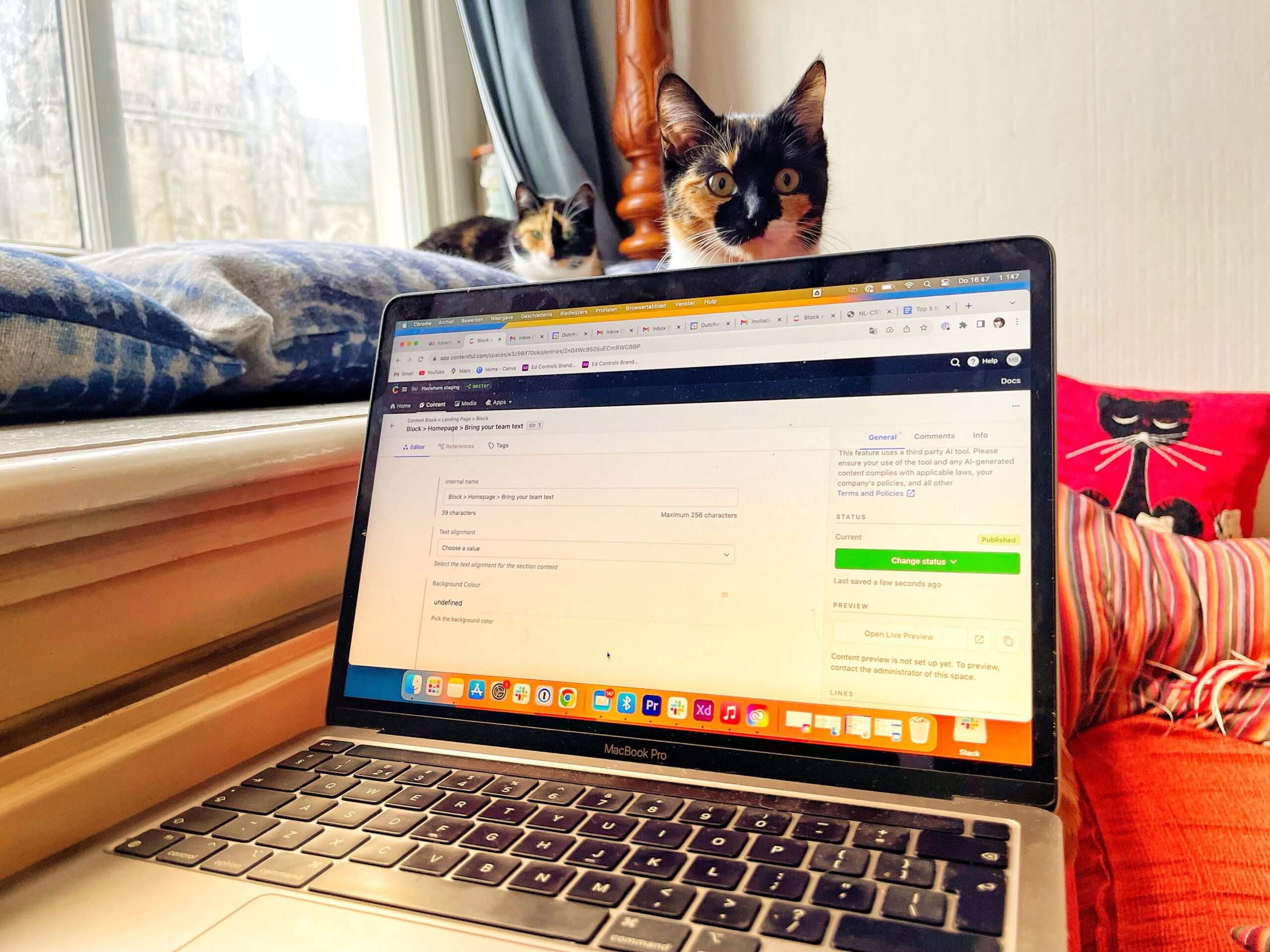 Dit is de thuiswerkplek van Joke van RBM (gezellig met fotogenieke Pluk)