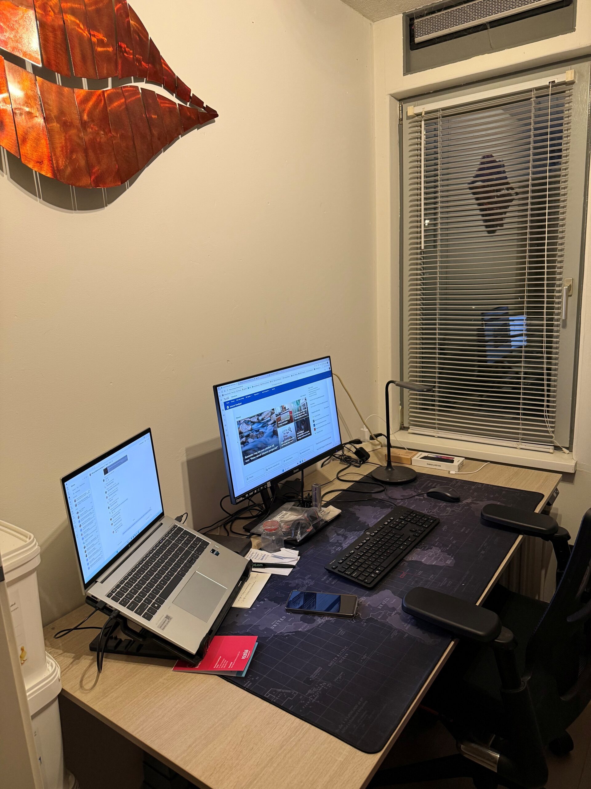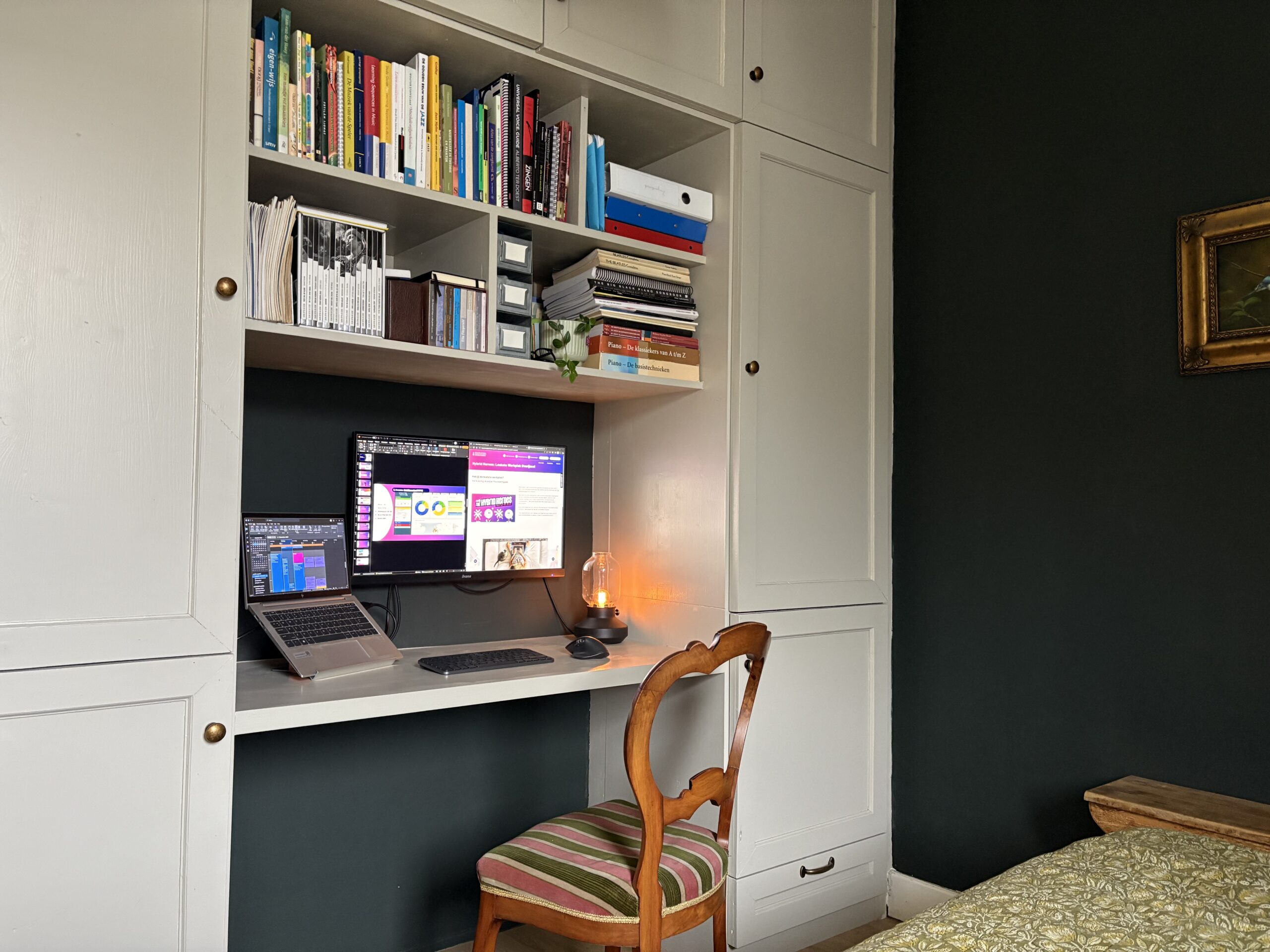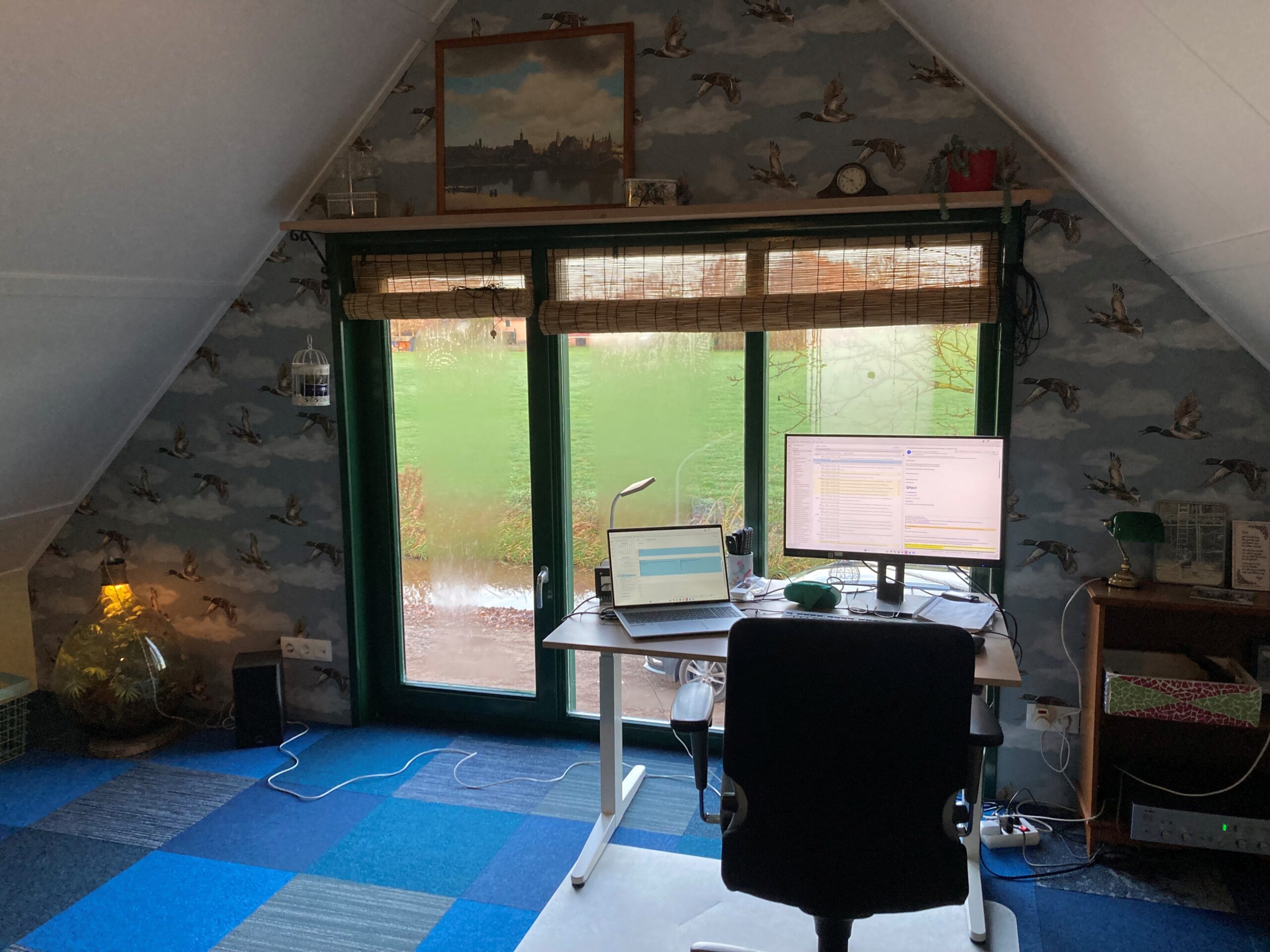 Dit is de thuiswerkplek van Job van Inkoop (met zicht over de weilanden en een schilderij van Vermeer)
