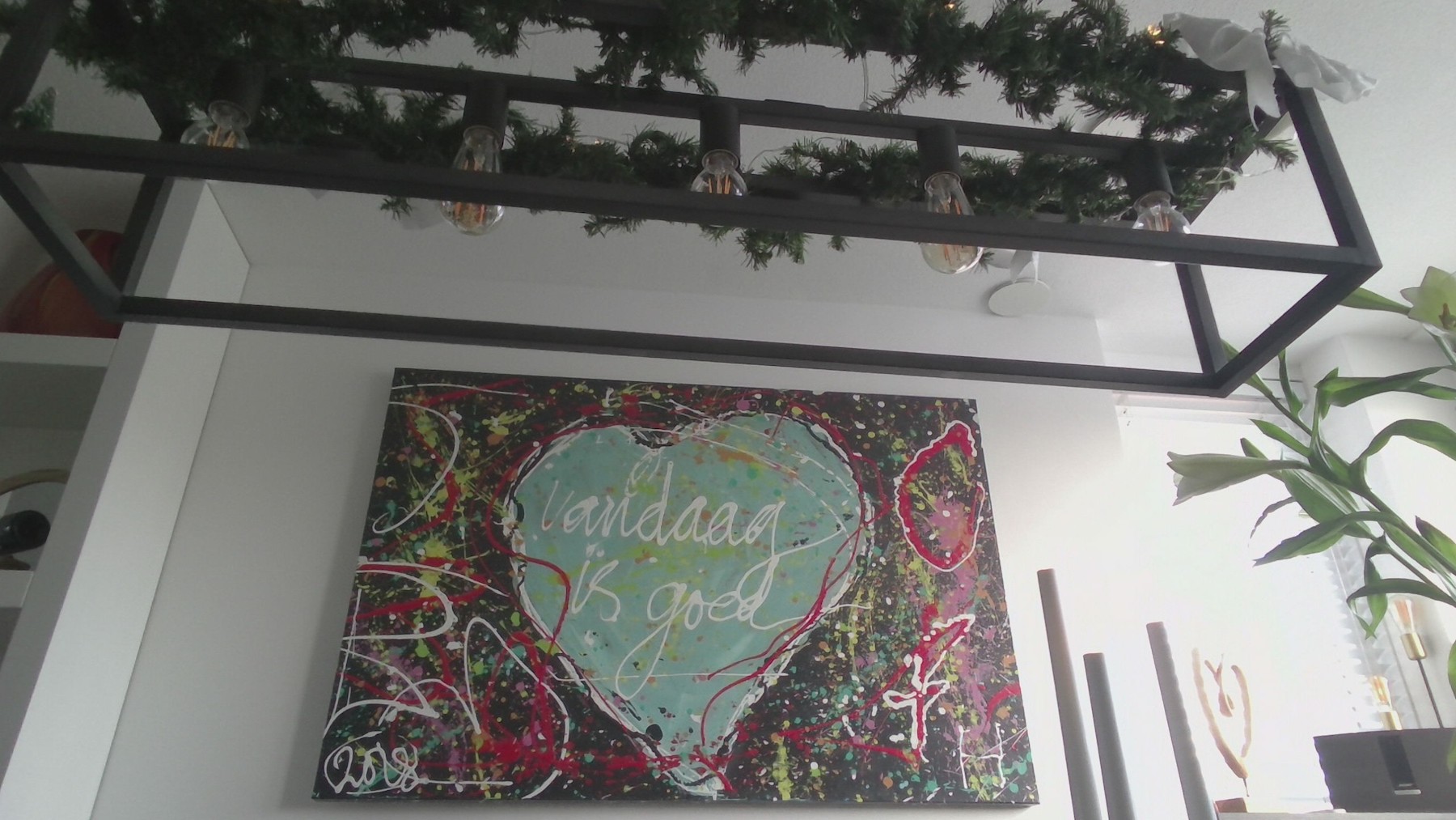 Dit is de thuiswerkplek van Linda van HR BV (door mij en mijn gezin gemaakt schilderij met de pakkende titel "Vandaag is goed!")