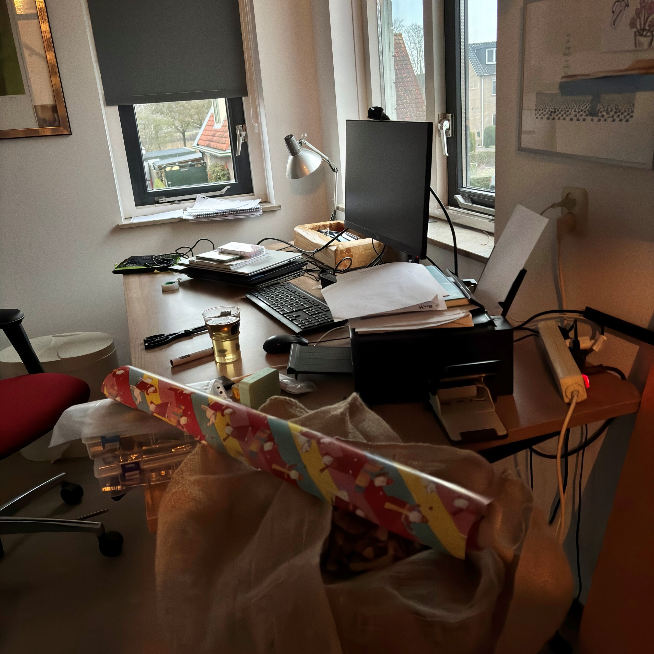 Dit is de thuiswerkplek van Hanneke, RBS (werkplek in de pakjeskamer mag niet ontbreken deze week)