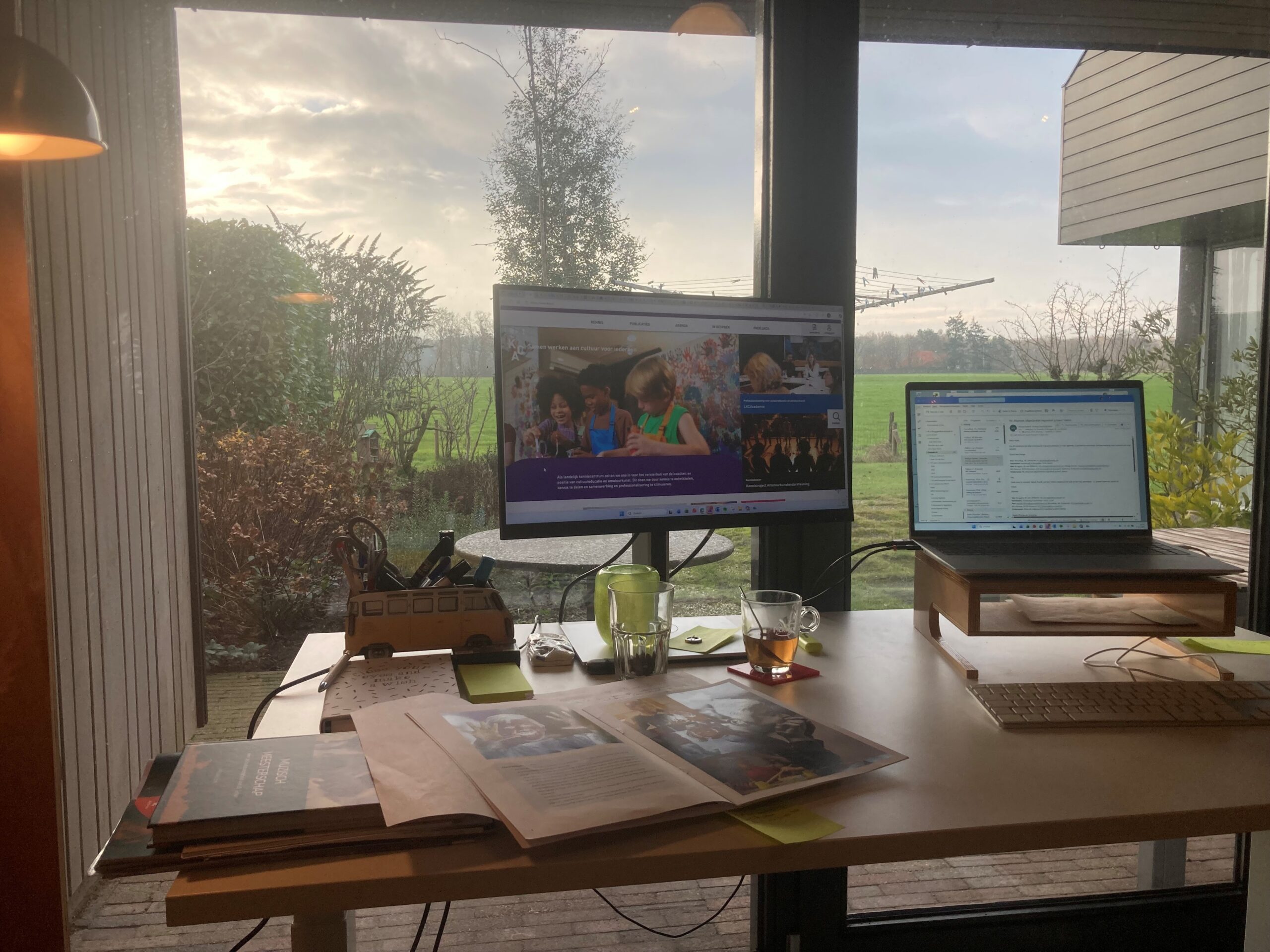 Dit is de thuiswerkplek van Willem van Cultuur&Erfgoed (Deze week nog wat vaker genieten met uitzicht op het Twentse landschap.)